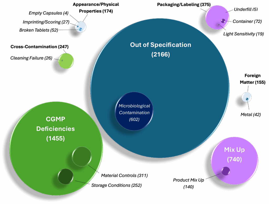 Figure 1. Not the Unusual Suspects – Oral Dosage Form Recalls from 2012-2025. The above figure displays all 5,312 oral dosage form recalls included in FDA’s Data Dashboard from June 2012 to August 2025. These recalls were sorted into the following seven Defect categories (see parent bubbles, above): Out of Specification, CGMP Deficiencies, Mix Up, Cross-Contamination, Appearance/Physical Properties, Packaging/Labeling, and Foreign Matter. A subset of recalls were sorted into Sub-defect categories (see child bubbles, above): Cleaning Validation, Raw Material Controls, Metal, Imprinting/Scoring, Empty Capsules, Broken Tablets, Product Mix-ups, Container Defect, Light Sensitivity, Underfill, Microbiological Contamination, and Storage Conditions. The numbers adjacent each Defect and Sub-defect category correspond to an individual recall line item. Each Sub-defect in the above figure is further elaborated on in the narrative of this white paper.