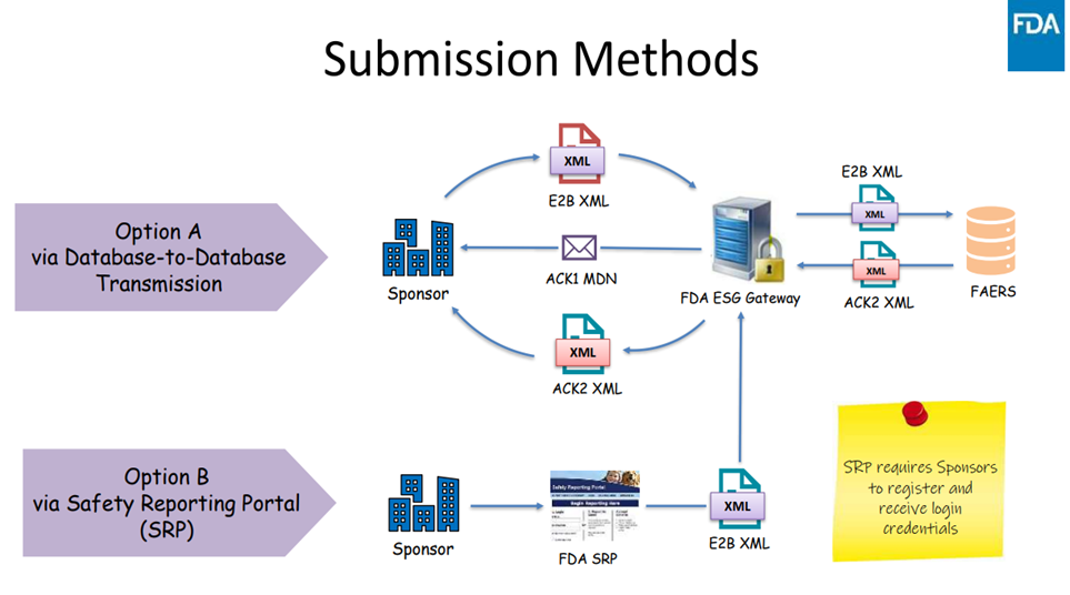 - ICSR Option A: Database-to-Database Transmission – Submitters who have database-to-database transmission capability may directly submit ICSRs in the XML format via the FDA Electronic Submissions Gateway (FDA ESG)